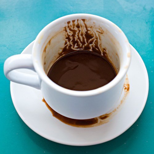 Make sure you leave a little of the liquid as well as the grounds in your cup. Swirl the cup and contents right to left if you are right-handed or left to right if you are left-handed.